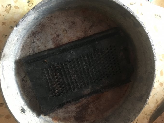 запекаем их в старой сковородке на плите (кладём их например на