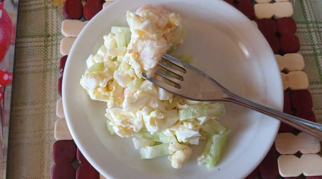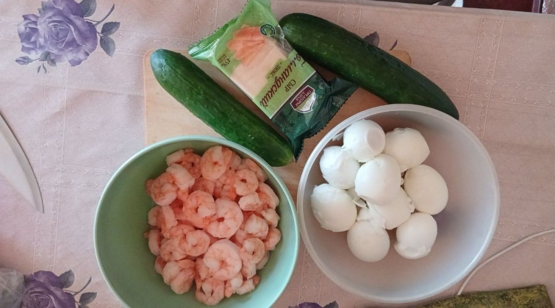 | Салат с креветками, яйцами, сыром и огурцом |