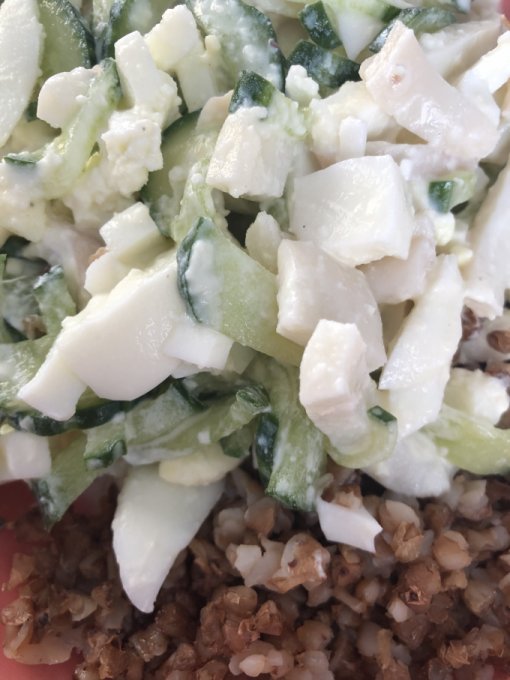 П.С. На фото салат с кальмаром, огурцом, яйцом и домашним