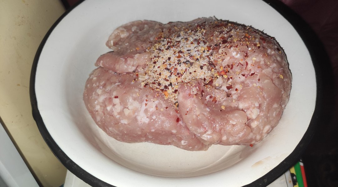В фарш (у меня фарш безработицы курицы) добавляем любимые специи. Я добавила немного чеснока в порошке и чили-соли.