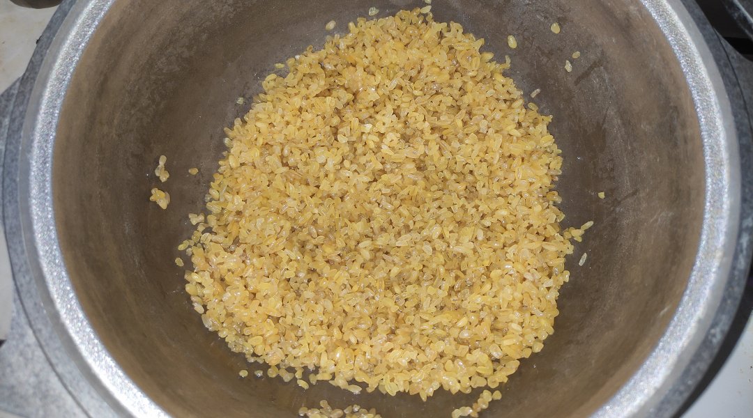 Масло разогреть, высыпать булгур, обжарить до подсыхания и появления золотистого оттенка.