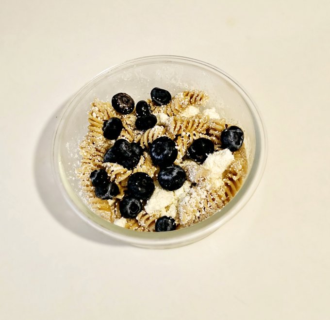 Завтрак (сегодня у меня творог с макаронами и голубикой) пробую