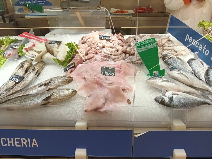 редко привозят свежую скумбрию, она из рыб самая дешёвая, около 8€.