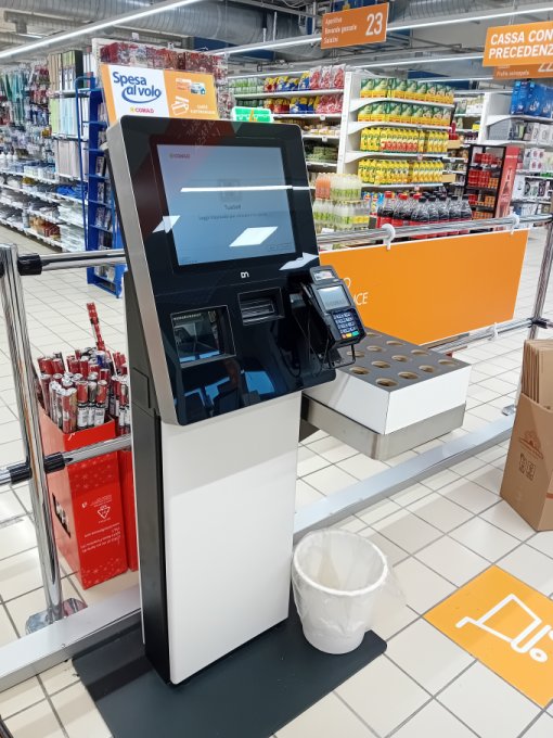 подходишь к терминалу, который "читает " твои закупы. Платишь. Все