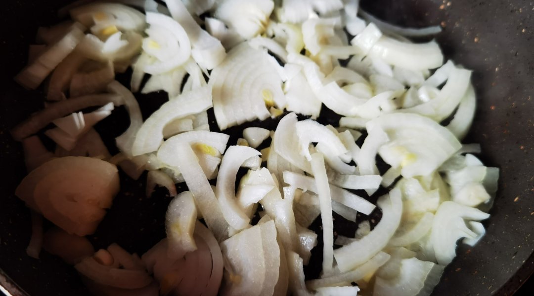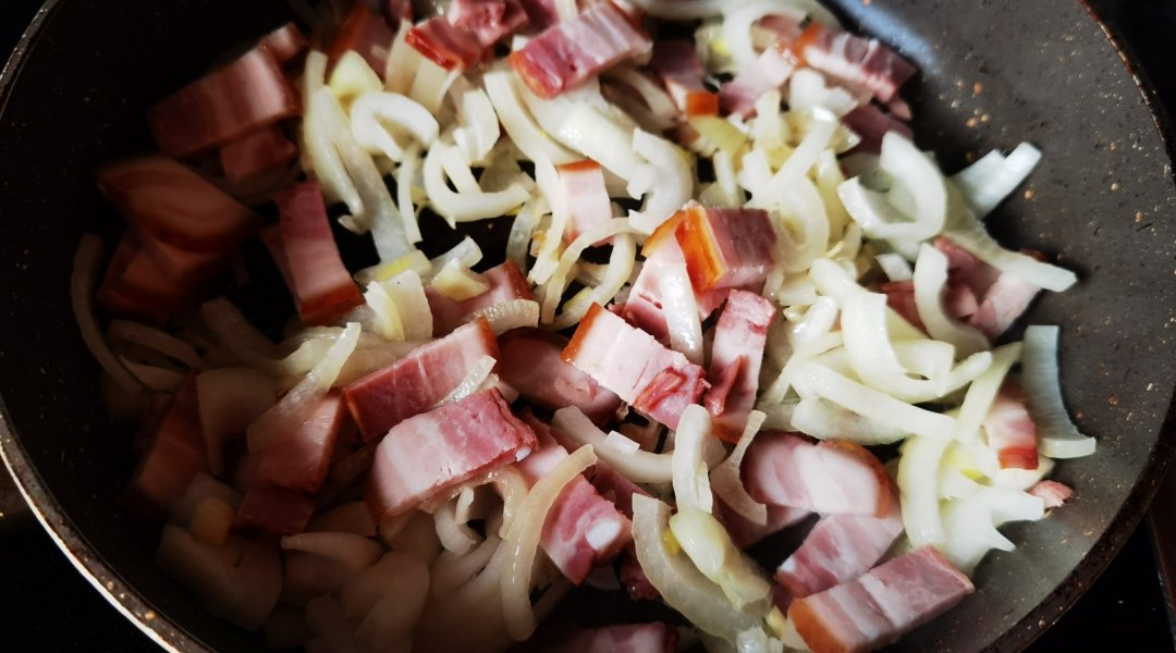 В сковородку или сотейник выложить сливочное масло и обжарить лук до приятного золотистого цвета. Добавить к луку грудинку и обжарить.