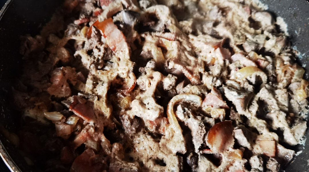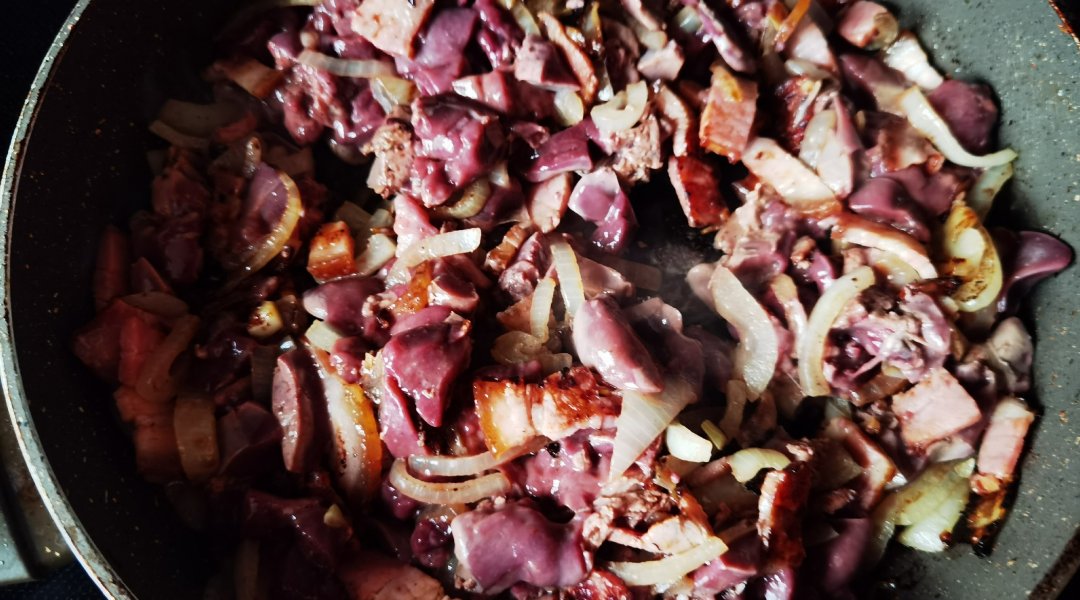 Порезать куриную печень небольшими кусочками. Лук нарезать полукольцами. Грудинку порезать на небольшие полоски.