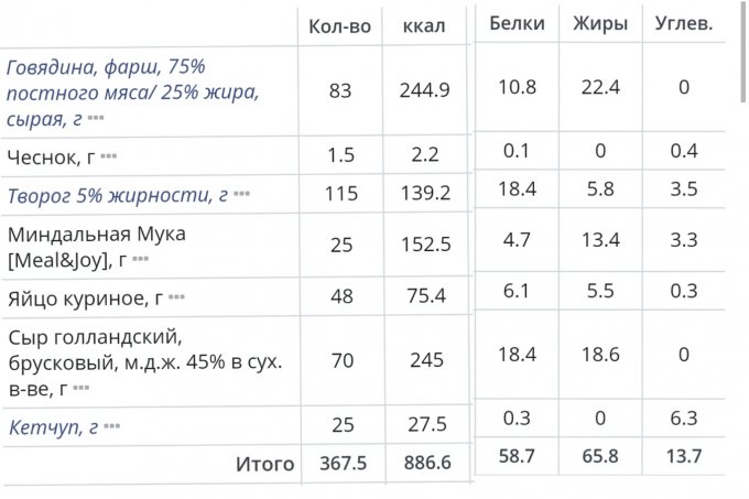 | Кол-во | Калории | Белки | Жиры | Углеводы | |