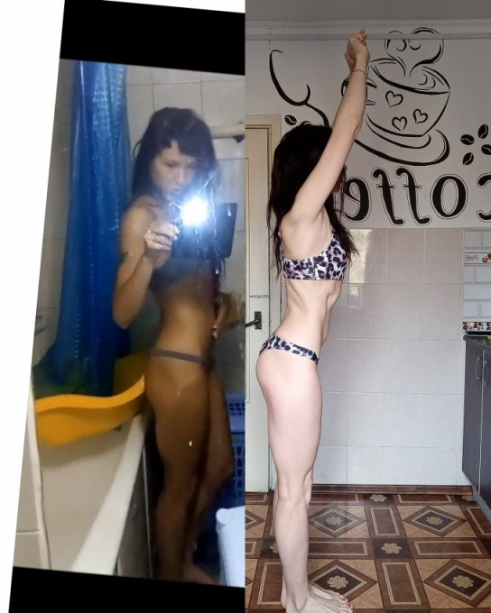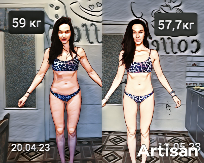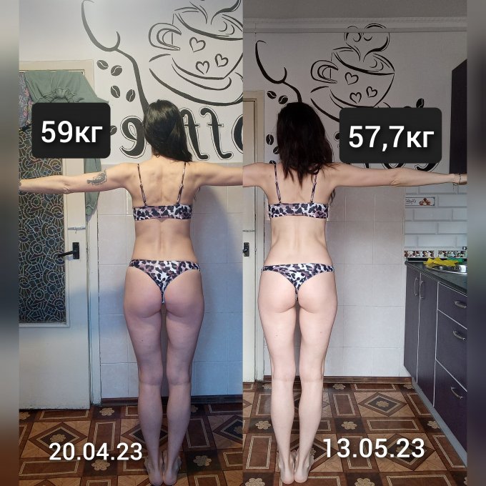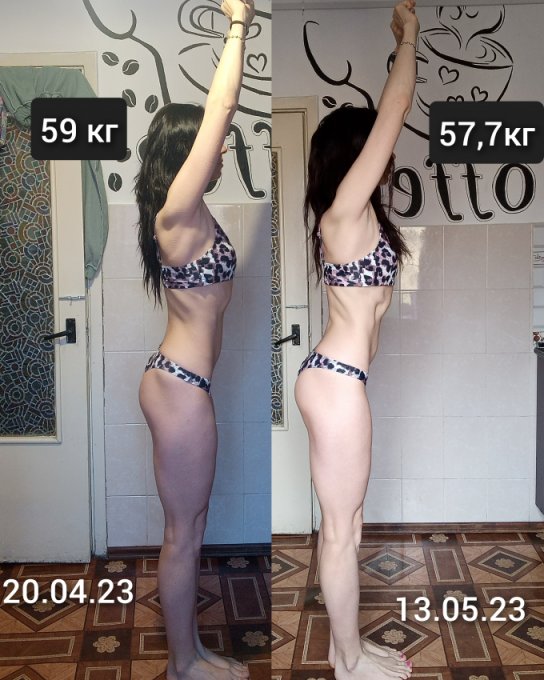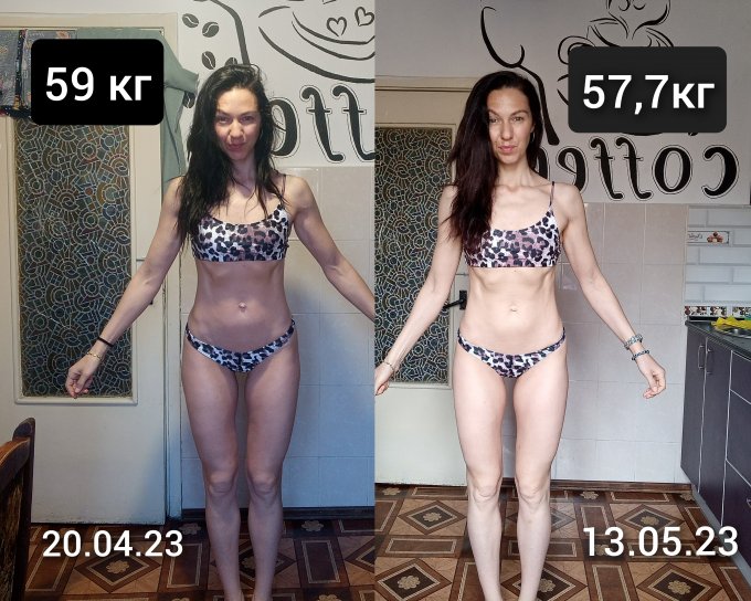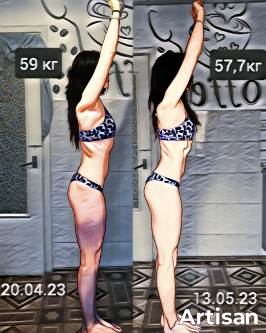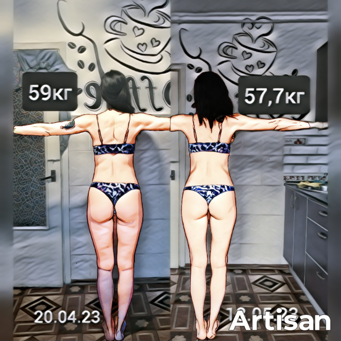 2 недели и 2 дня (я всё напутала 😱. Оказывается первые фотки были сделаны 16 дней назад 27.04) По факту изменения только за последнюю неделю (до этого вес рос, зажоры мучали) . Нуууу как изменения 🤭..... такие невидимые, что я заморочилась и прогнала через фильтр 🕵, чтобы увидеть "текстуру" тела 😅