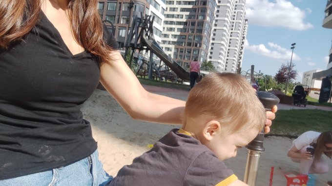 Меня мамочка пришла сгонять (при пустых других качелях), так что