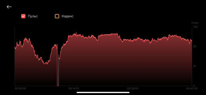 И оп! В середине тренировки провал в кетоз (если там не была). Конкретная такая ступенька по пульсу вверх. Спасибо за наблюдение, очень интересно.