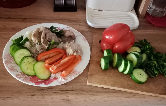 Вот и обед подъехал - тушёное филе бедра в мультин, рис и салат, прям как доктор прописал - белки, жиры, углеводы