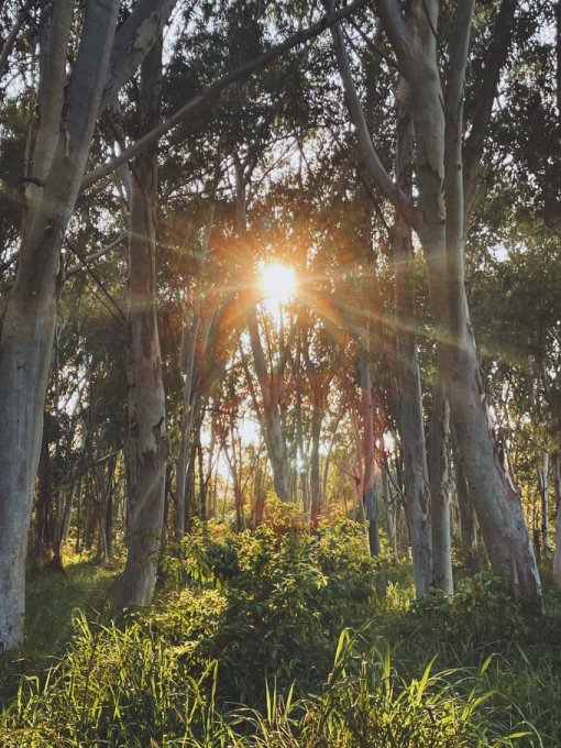 Прошлись по эвкалиптовой роще. Солнце медленно садилось за горизонт и очень красиво освещало её.