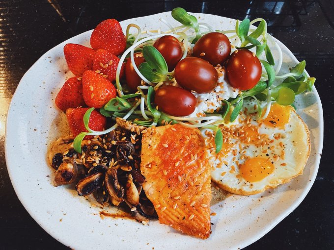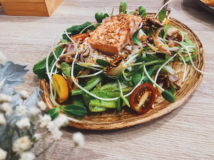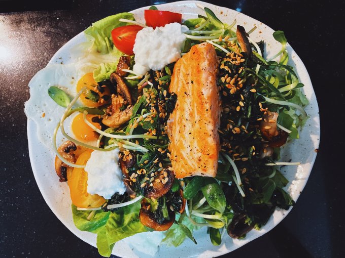 Вечером был вот такой салат с лососем: повторение пятничного варианта. Тоже он мне понравился по сочетанию нутриентов, сытности, красоты и вкуса. Вот буквально всё в одном ❤️.