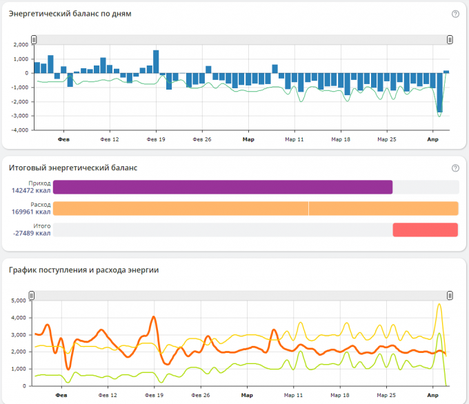 меняя ничего в питании, весь расход калорий с часов и динамику