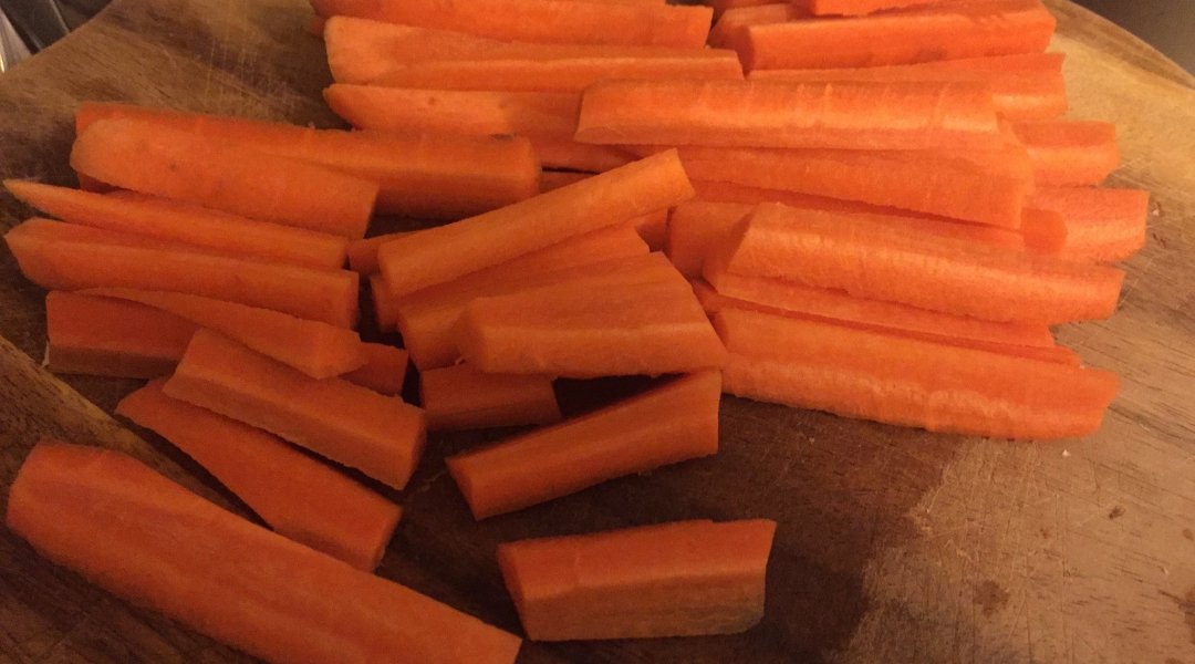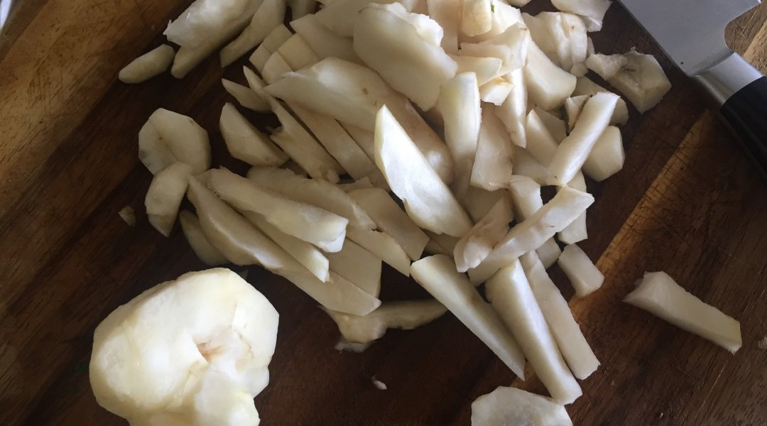Топинамбур нарезать соломкой. На этом этапе можно срезать все