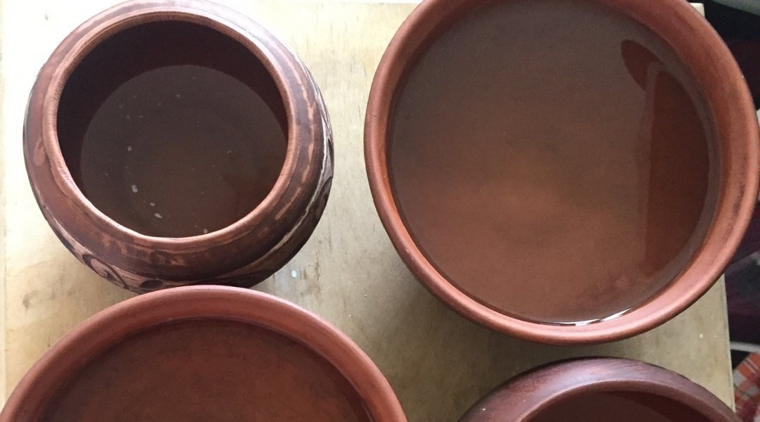 Горшочки из необожжённый глины залить холодной водой, чтобы блюдо
