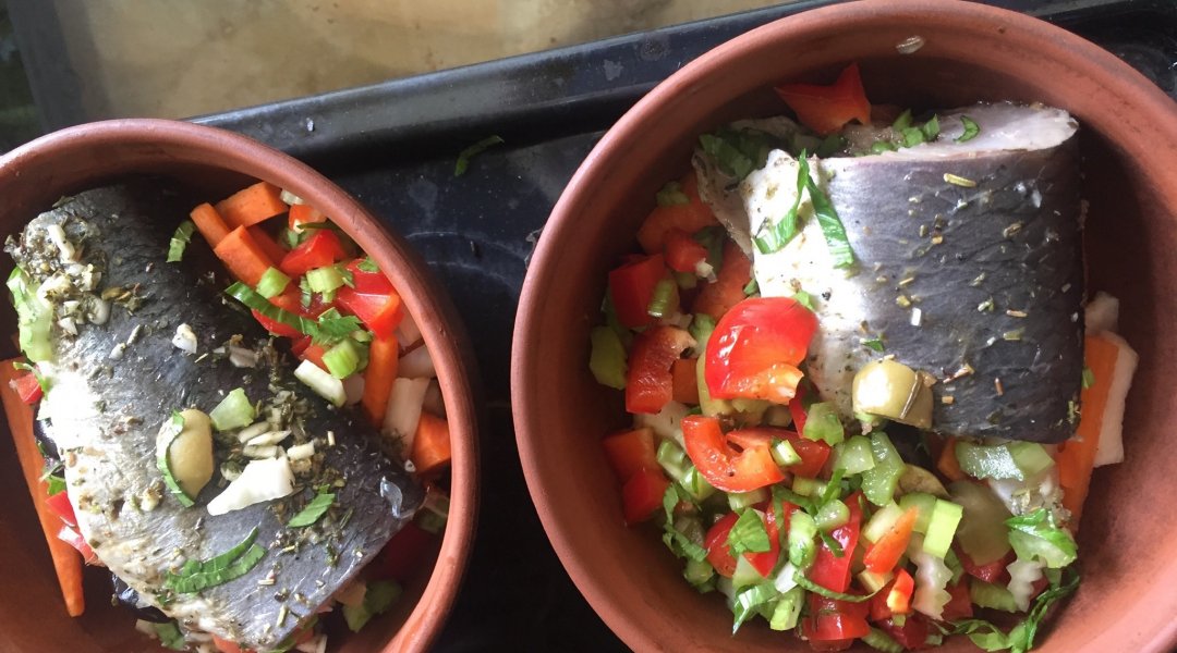 Нашпиговать рыбу смесью из сельдерея, болгарского перца с оливками.