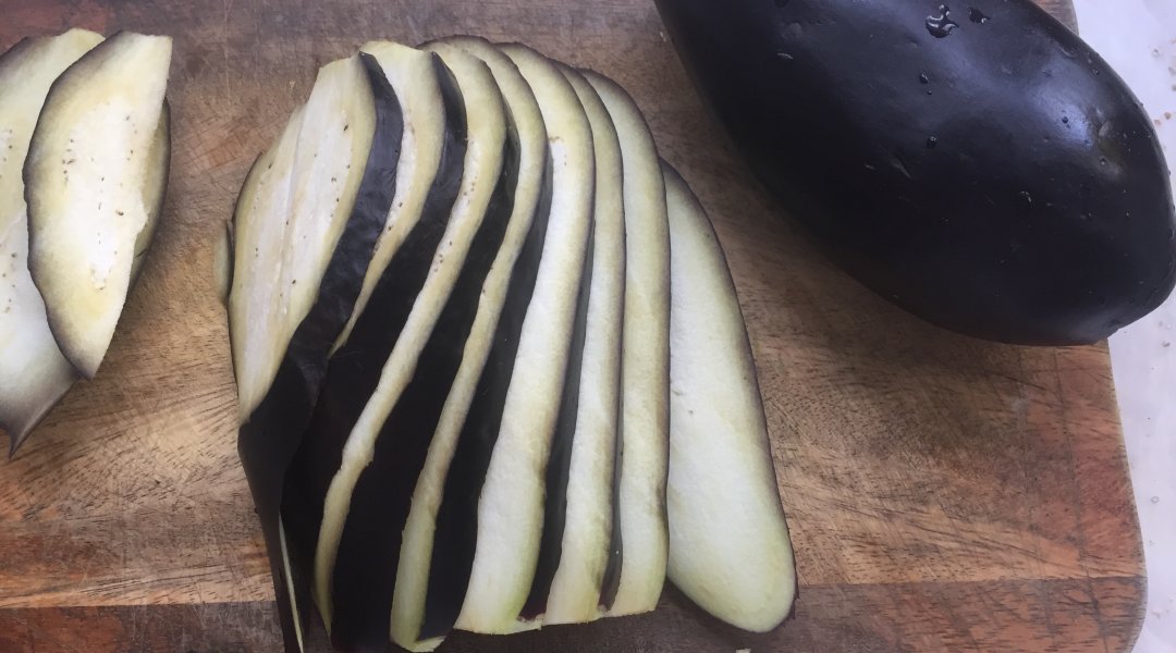 Баклажаны вымыть и разрезать как можно тоньше вдоль.