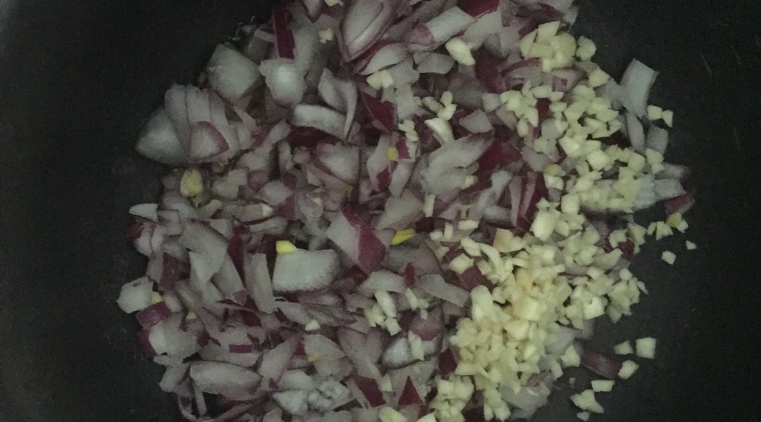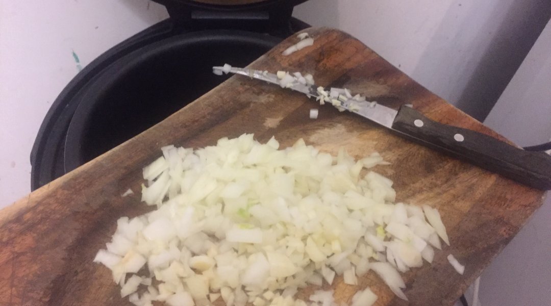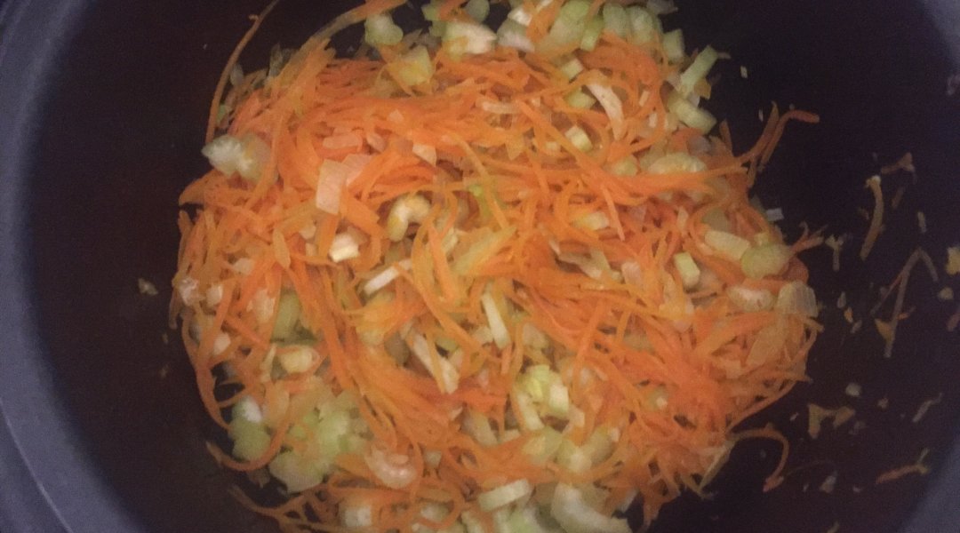 Лук и чеснок мелко нарезать, сложить припускать в чашу мультиварки с разогретыми остатками оливкового масла. Припускать до мягкости.