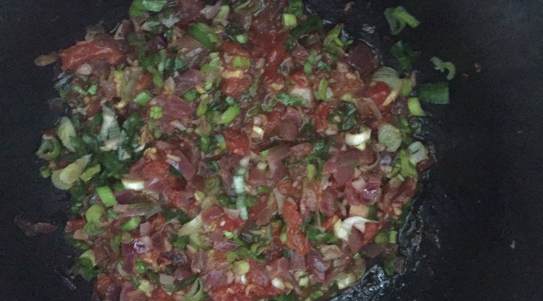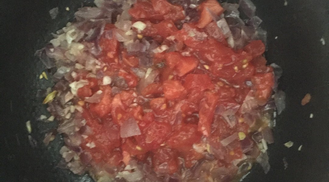 Добавить мелко нарезанные томаты черри (или свежие помидоры без кожи). Минут пять томить под закрытой крышкой. Сюда добавить сок лайма и тертую цедру остатков лайма.