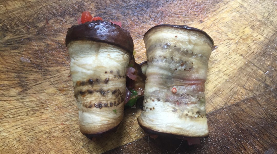 На лепестки запеченных баклажан выложить начинку из овощей.