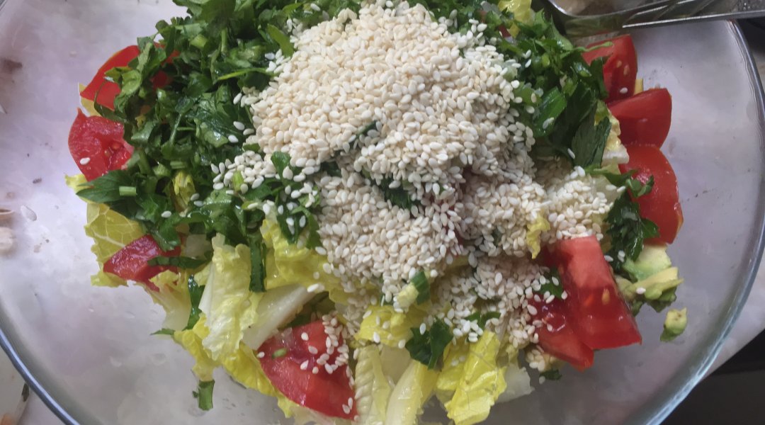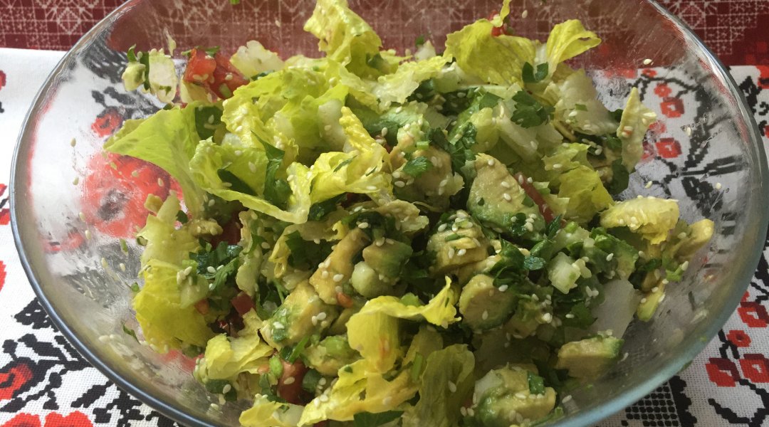Простой, базовый салат на каждый день. Сочные листья Романо, маслянистая структура авокадо, неожиданный взрыв вкуса семян кунжута, освежающая кислинка лайма создают насыщение на целый день.