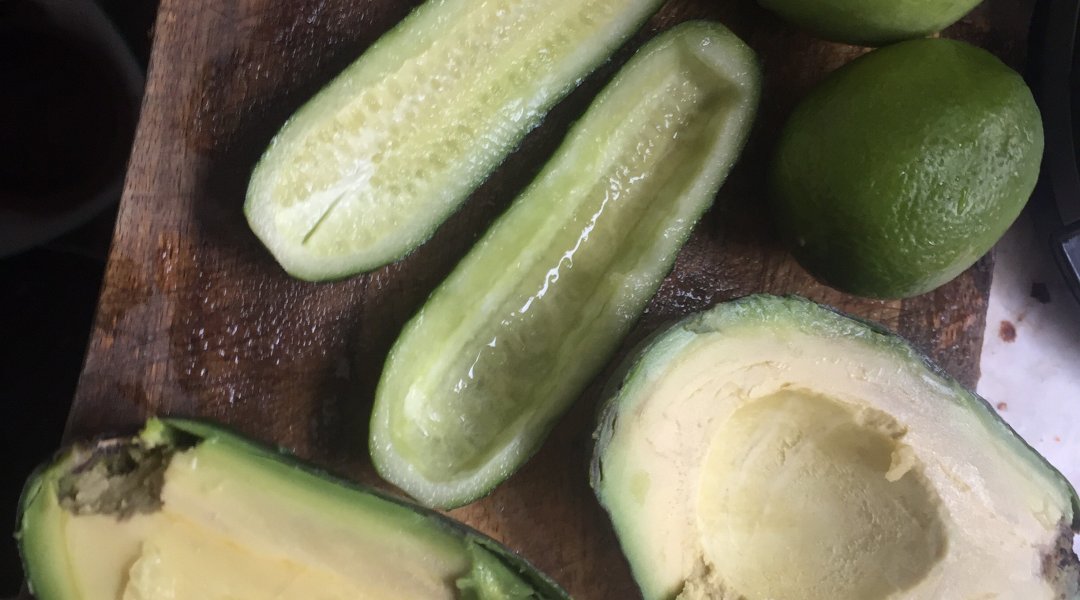 Овощи вымыть. Авокадо разрезать пополам. Вынуть ядро и нарезать мелкими кубиками (если большое, то половинку использовать). Огурец нарезать крупно. Лайм вымыть.