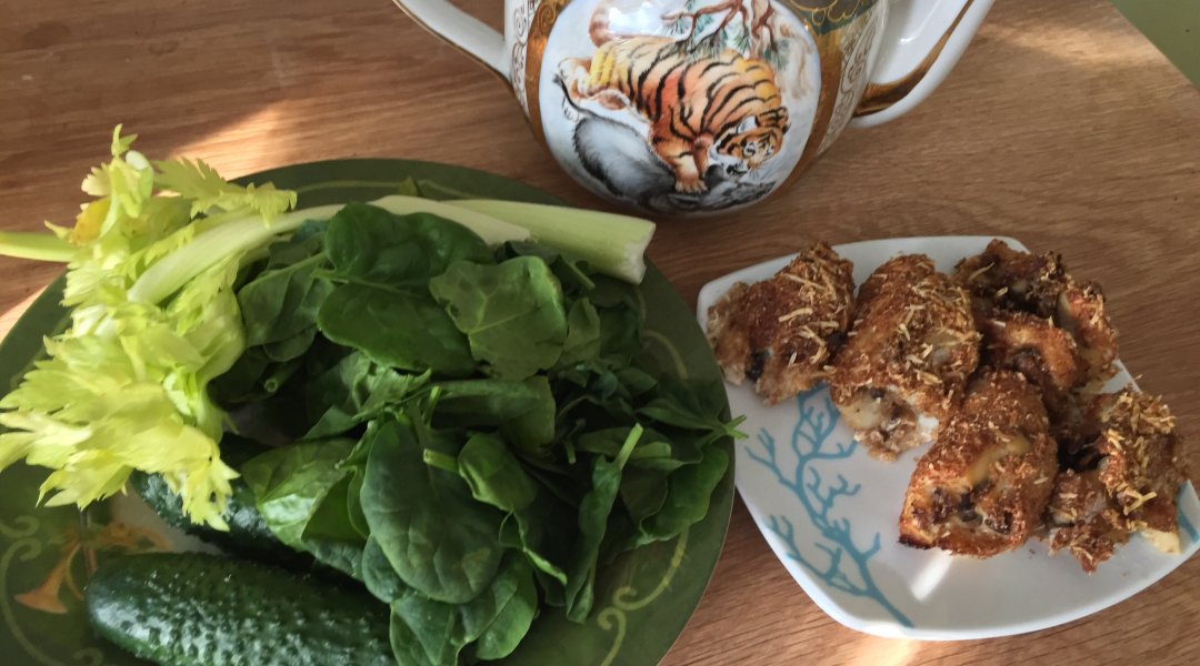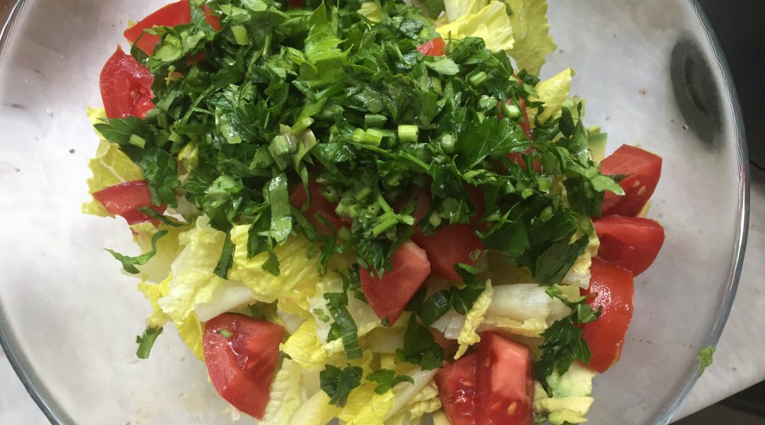 Натрещать стебли сельдерея, помидор, салат Романо порвать руками. Петрушку порубить. Все сложить в салатник.