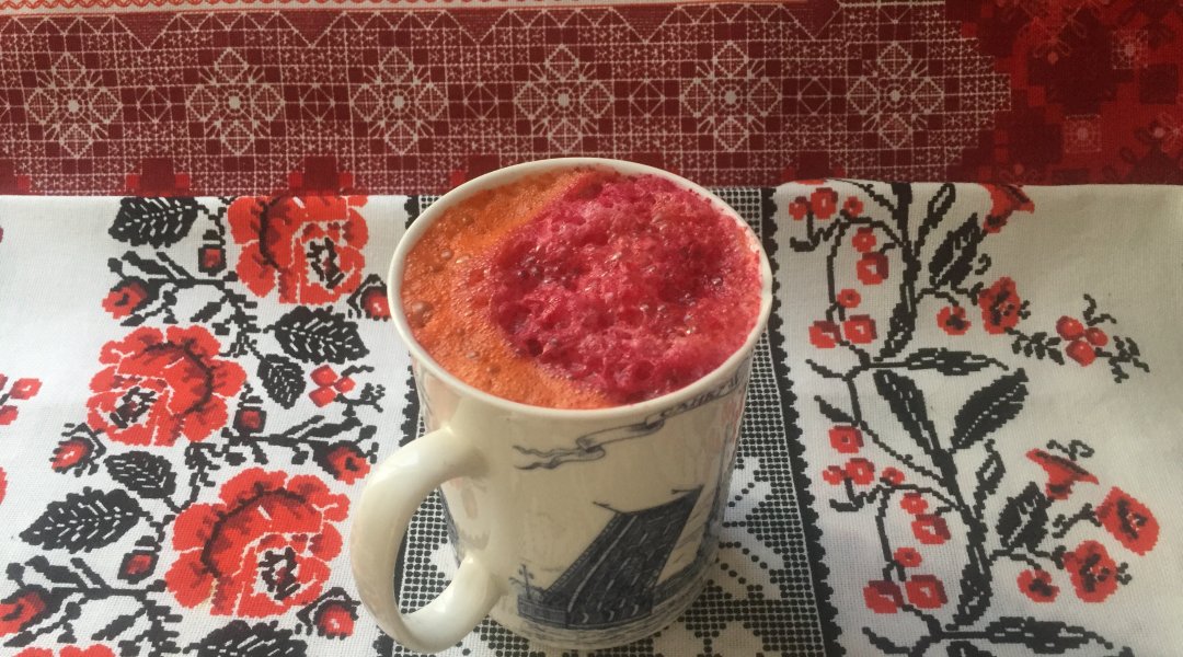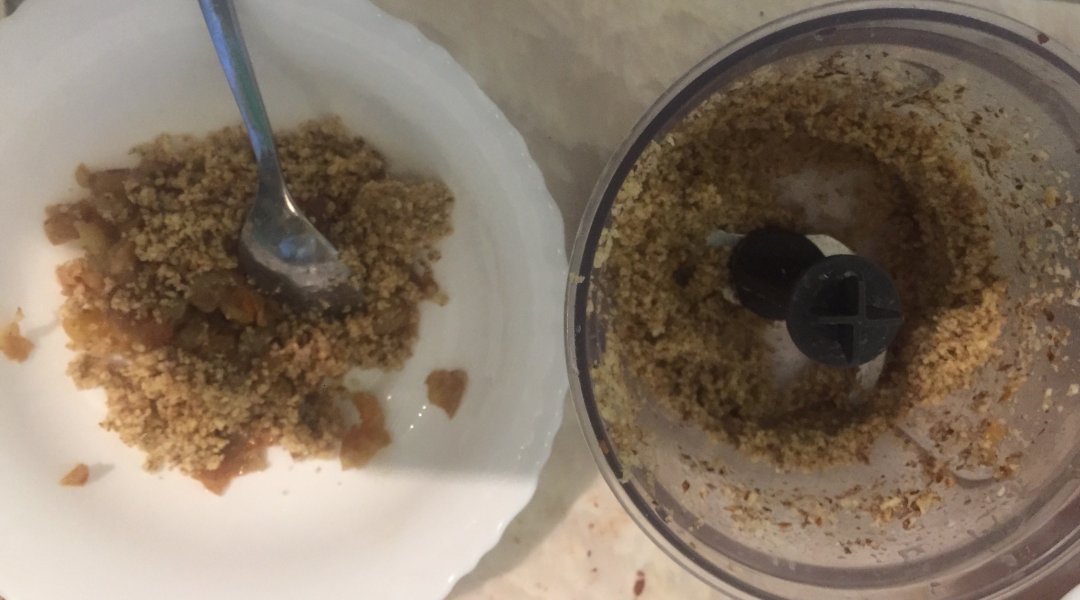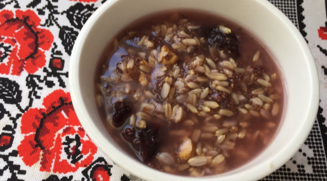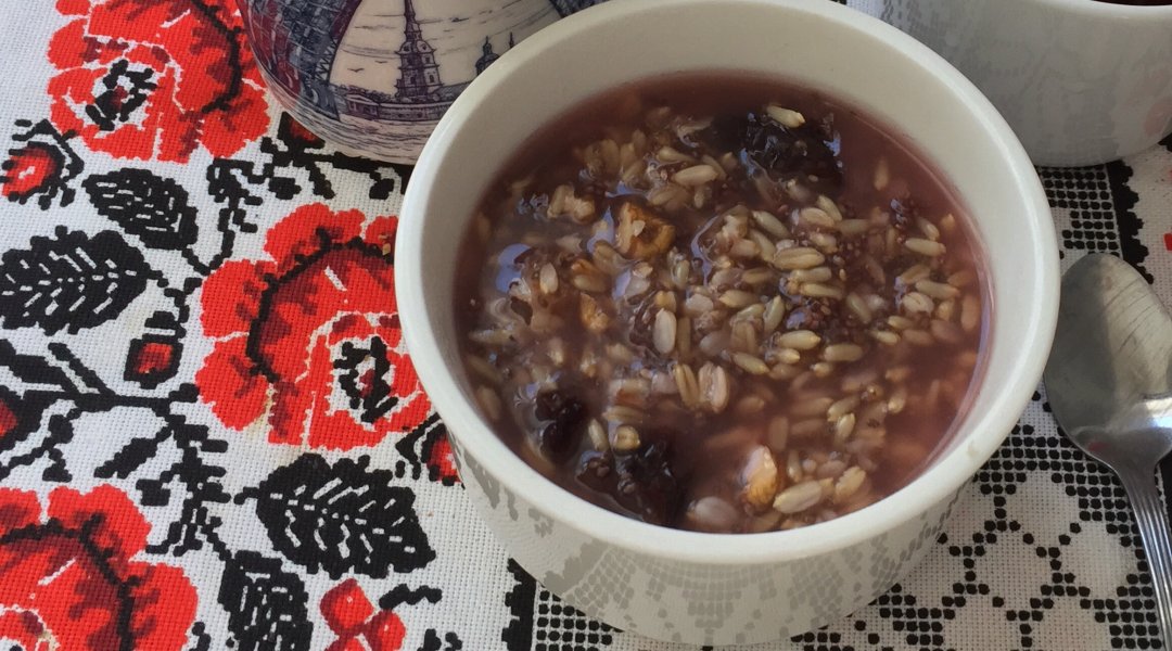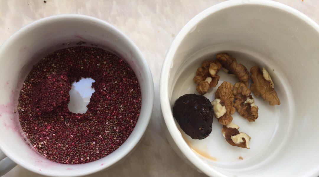 На ночь замочить овёс голозерный 40 г в кипяченой воде 160 г. В другой таре замочить черносливину. В третьей чашке замочить семена чиа в вишневом соке (у меня он сок-лёд из замороженной вишни). Грецкие орехи очистить и подготовить к употреблению.
