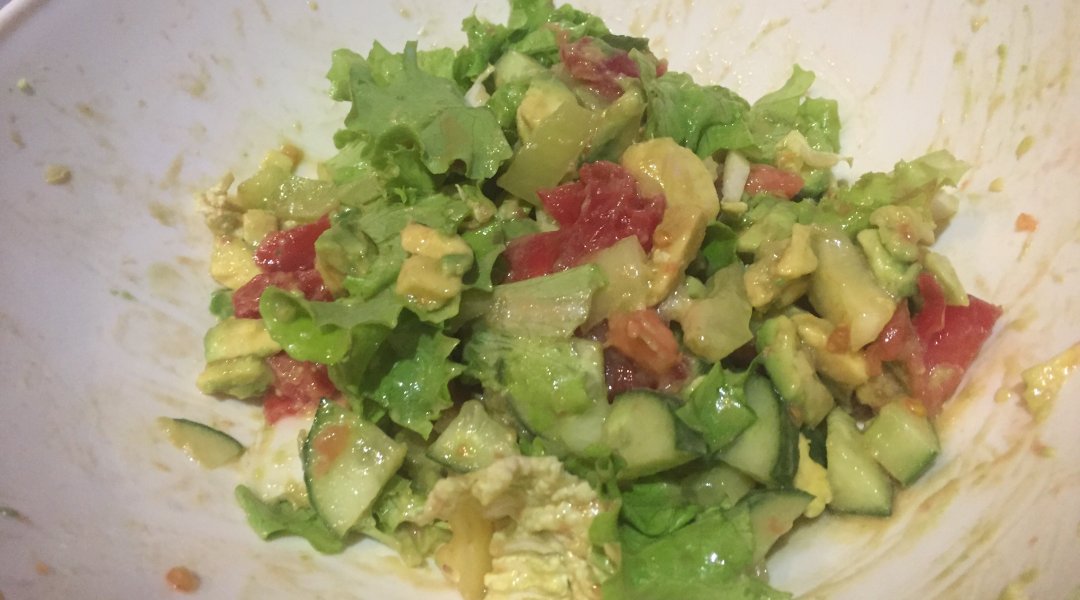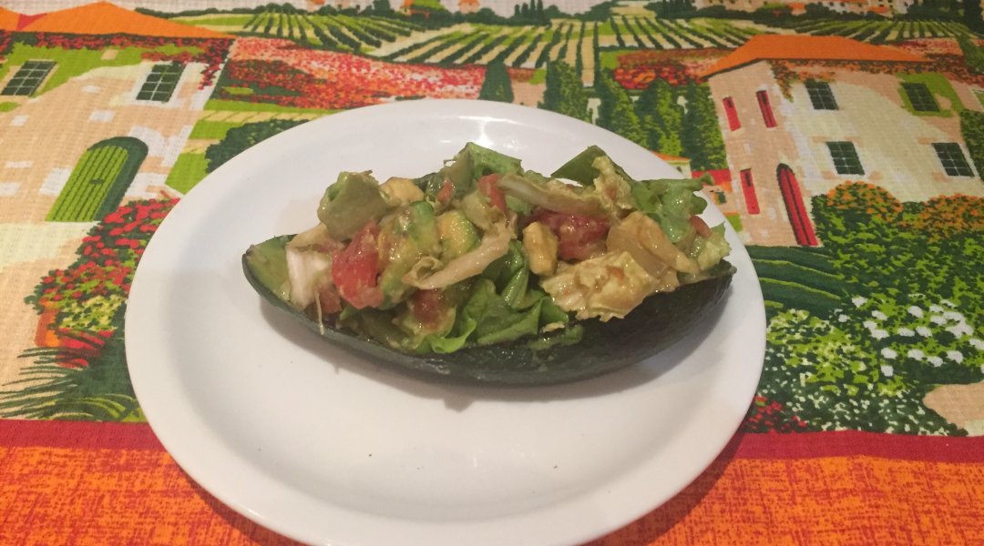 Спелое авокадо разрезать вдоль, осторожно выбрать мякоть, не повредив шкурку. Мякоть измельчить и добавить к овощам.