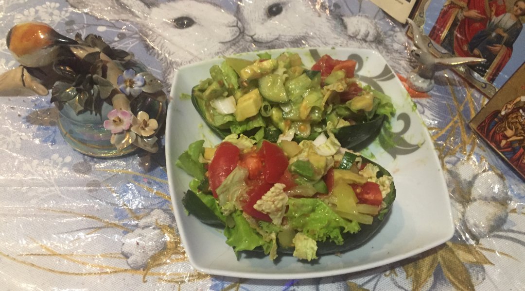 Смешайте лаймовый соус с овощами. Начините чашечки авокадо. Подавать сразу. Приятного аппетита!