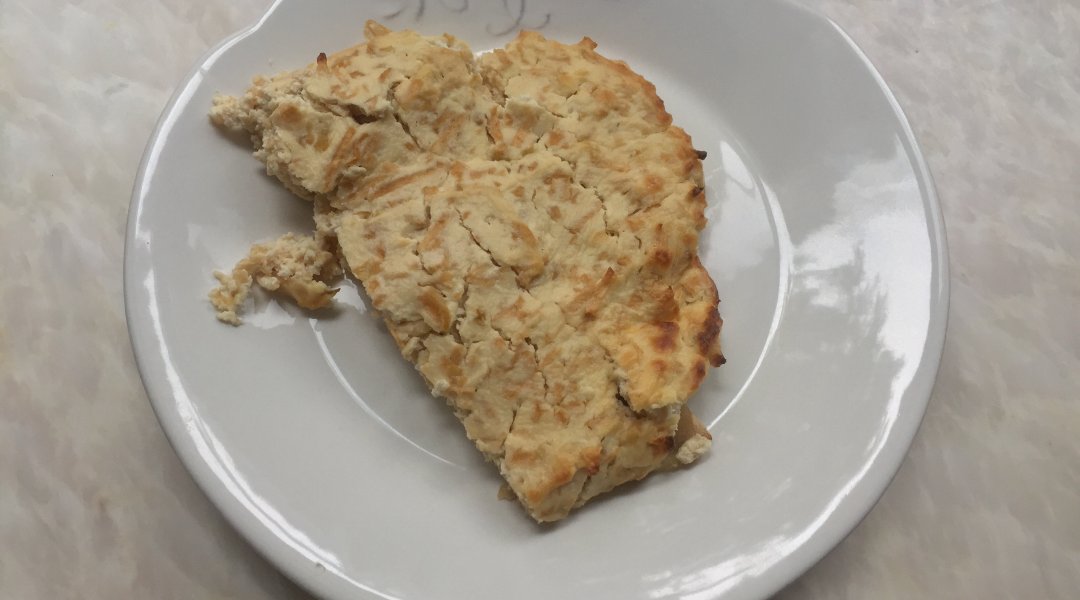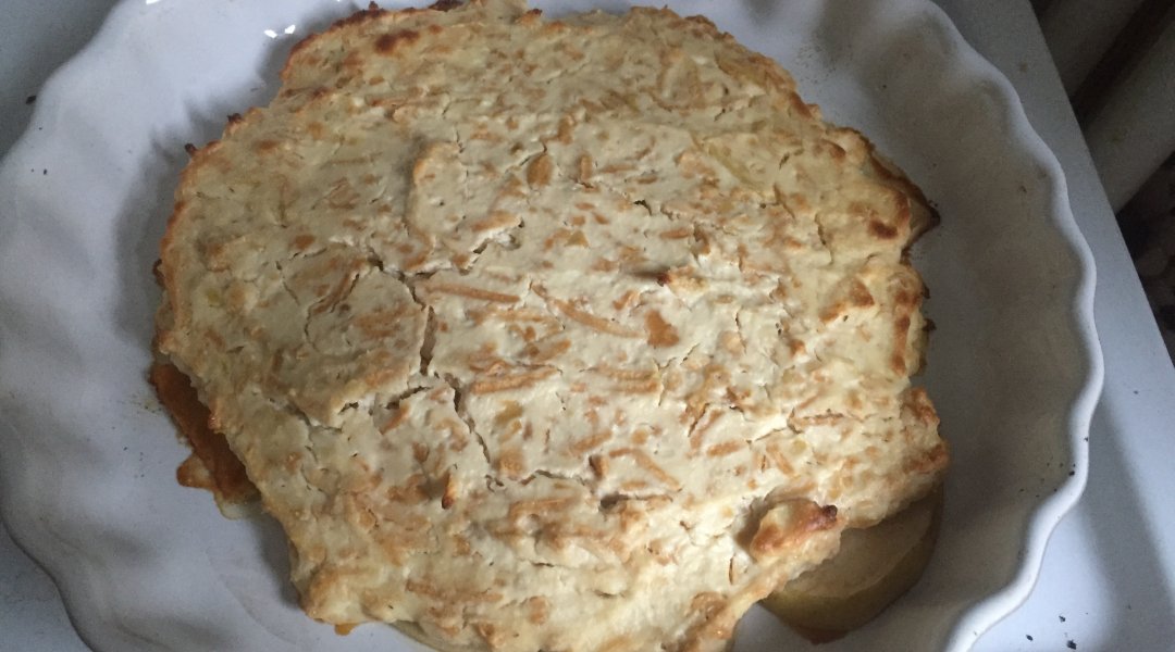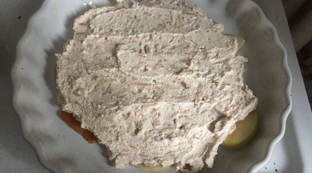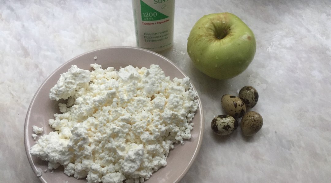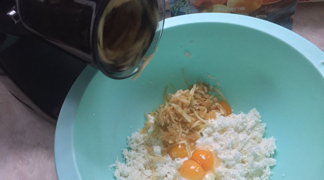 Перемешайте творог, протертые яблоки, яйца, растолчённые 4 таблетки
