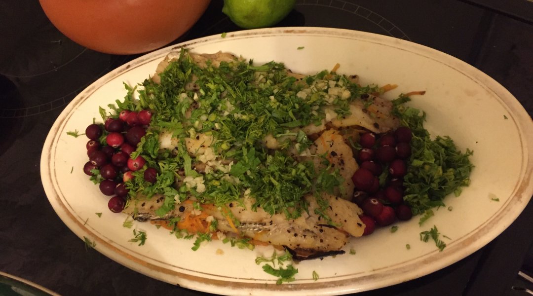Сверху посыпать рыбу свежей зеленью с чесноком.