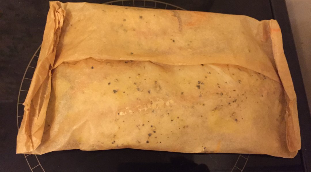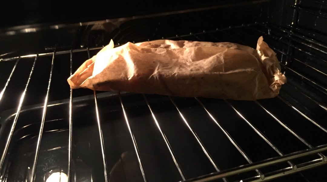 В конце запекания вскрыть конверт сверху и оставить запекаться 5
