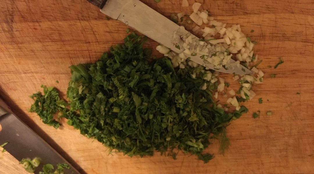 Зелень и чеснок тщательно вымыть, нашинковать.