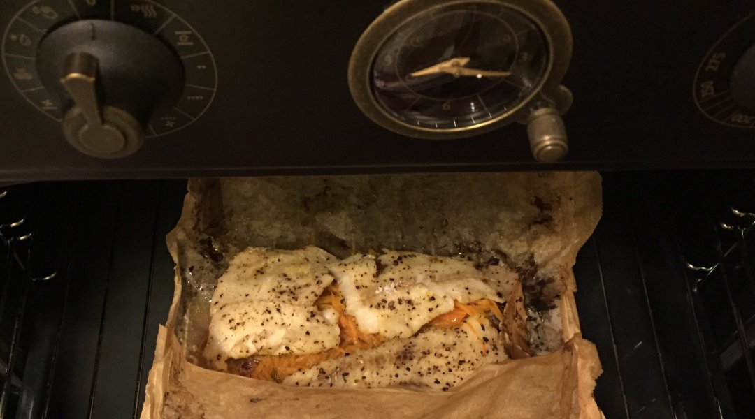 Поставить запекаться рыбу в разогретую до 170 градусов духовку на