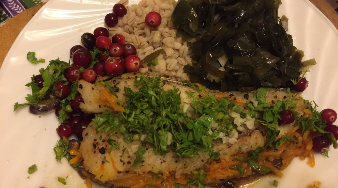 Подавать горячей. Со свежей клюквой, салатом из морской капусты и