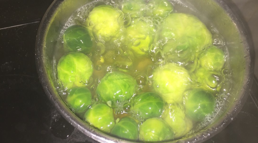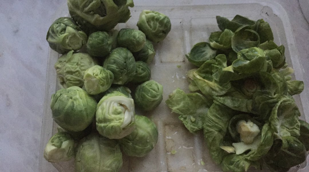 Брюссельскую капусту вымыть, снять первые два листа, вырезать