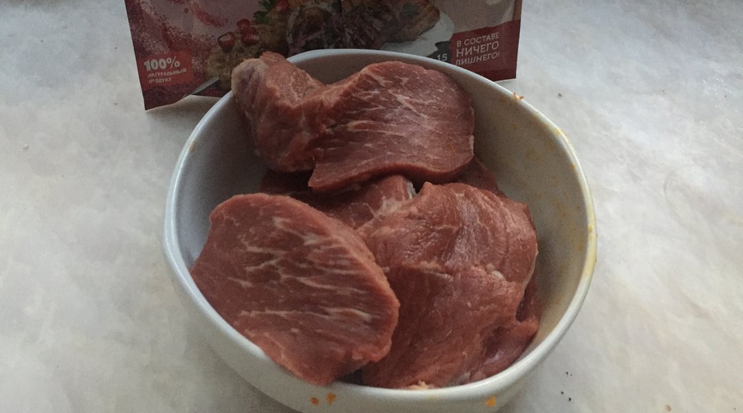 Мясо обмыть, вырезать весь жир, пленки, натрещать на куски для