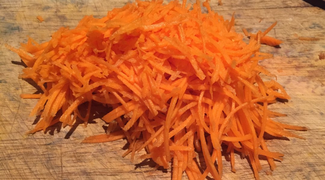 Морковь нашинкуйте соломкой. Положите в чашу мультиварки. Включить
