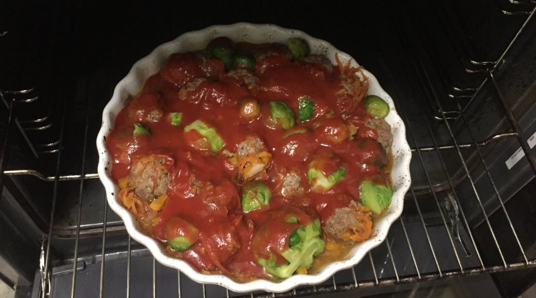 Выложить в форму для запекания фрикадельки с овощами, сверху залить