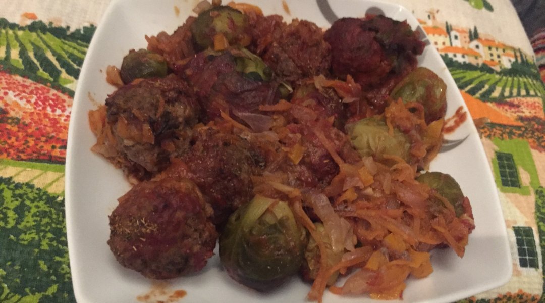 лета. Брюссельская капуста в обрамлении овощей и мясных шариков,