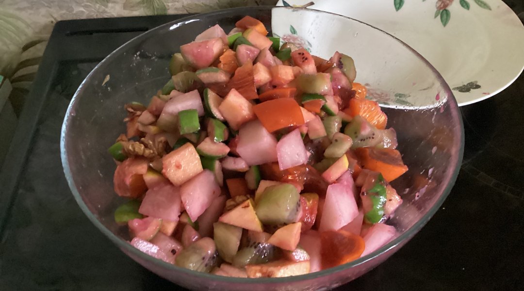 сока, спелой хурмы, киви и грецких орехов этот салат полезен для