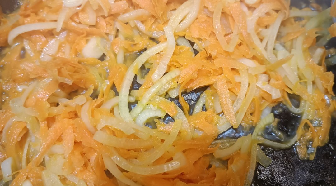 Капусту, морковь и лук, нашинковать. Капусту залить кипятком, оставить минут на 15 под крышкой. Лук и морковь сначала обжарить на капле масла, затем добавить воды и протушить. Рис отварить и слить воду.