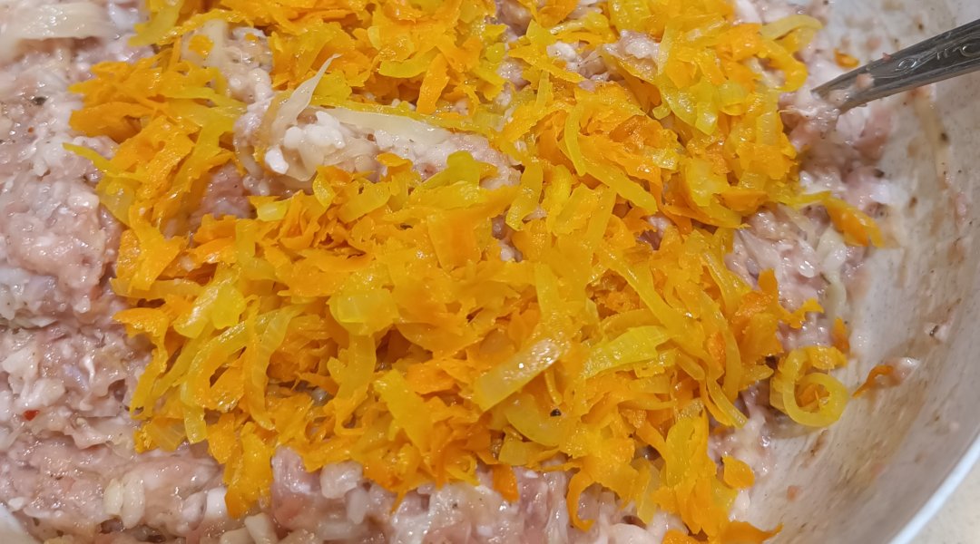 Затем с капусты слить воду, отжать воду, соединить с фаршем, туда же остывший лук, морковь и рис. Всё тщательно перемешать.