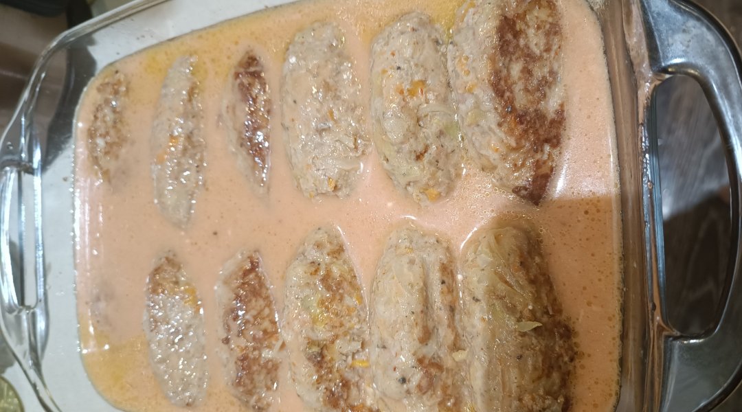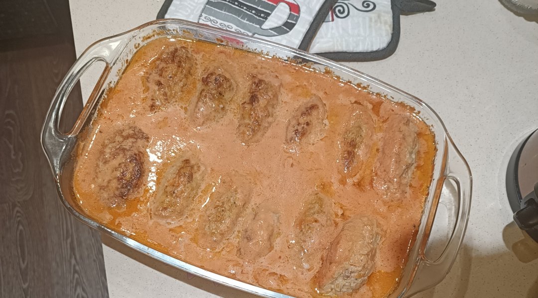 Влажными руками сформировать котлетки, обжарить на масле с обеих сторон под крышкой, до полуготовности. Выложить в форму для запекания. В отдельной миске соеденить томат паста, сметану и воду. Добавить по вкусу соль, сахар и залить голубчики. Поставить в духовку и запекать до готовности минут 20 при температуре 200 градусов. Подавать с любым гарниром.