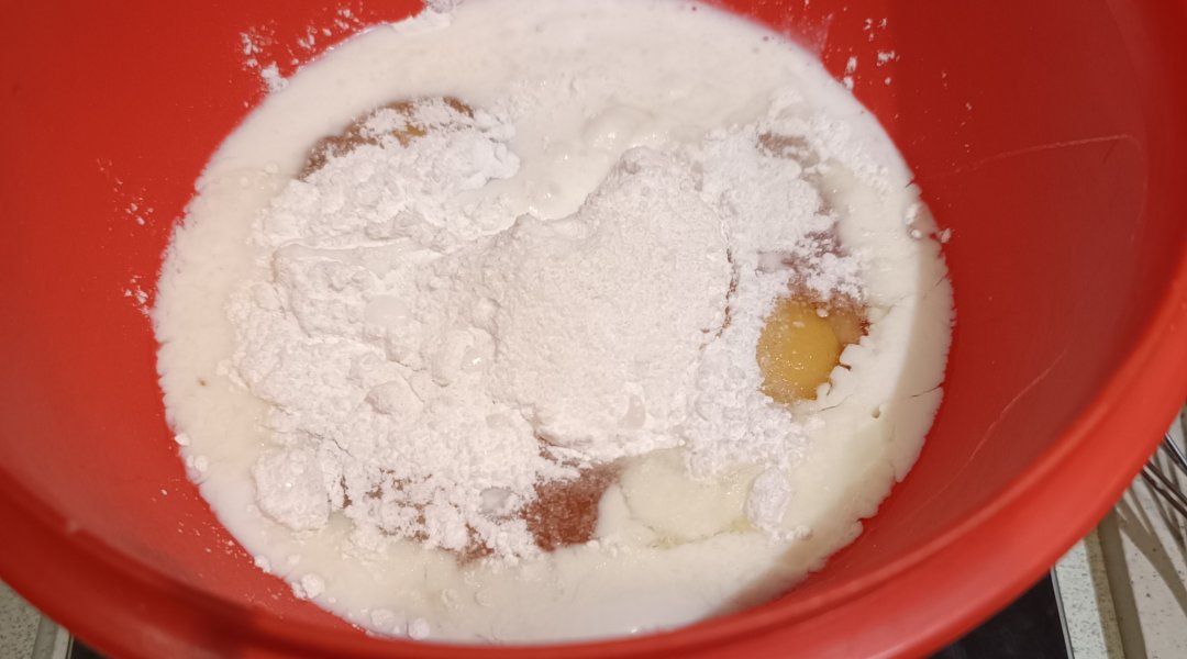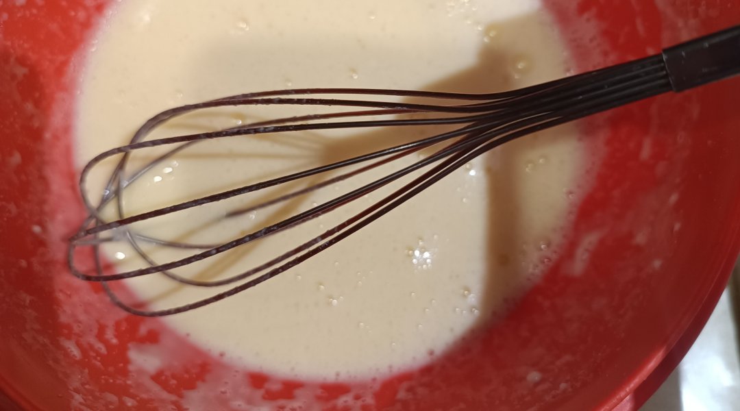 В миске смешать яйца, молоко, разрыхлитель, соль и сах зам по вкусу, три столовые ложки рисовой муки, в конце добавить каплю растительного масла