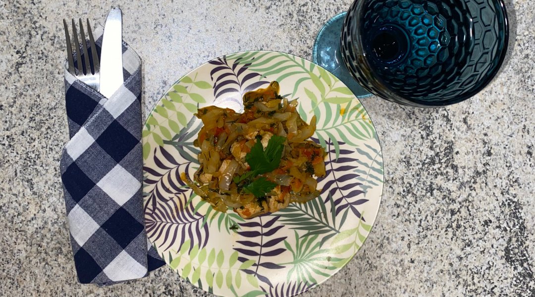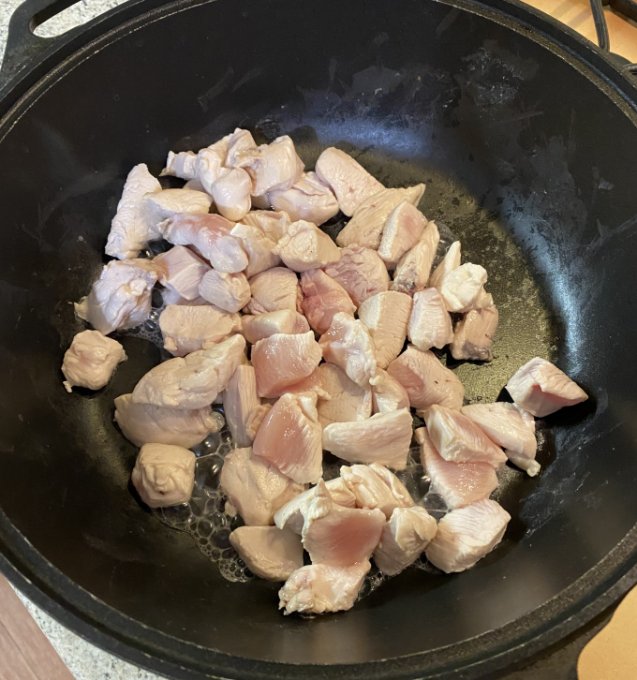 2.1. На раскаленной сковороде слегка обжарить ломтики куриной