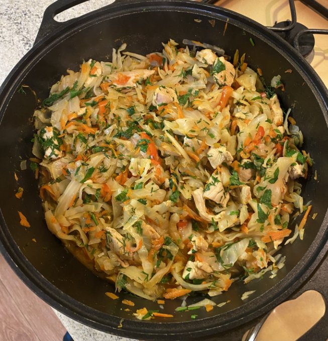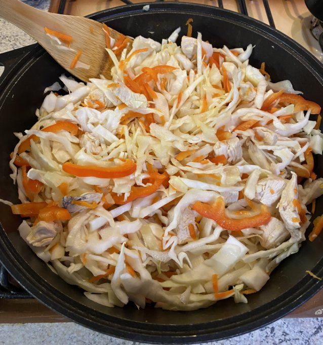 2.4. Добавить капусту и всё перемешать, обжаривать вместе ~ 3-5