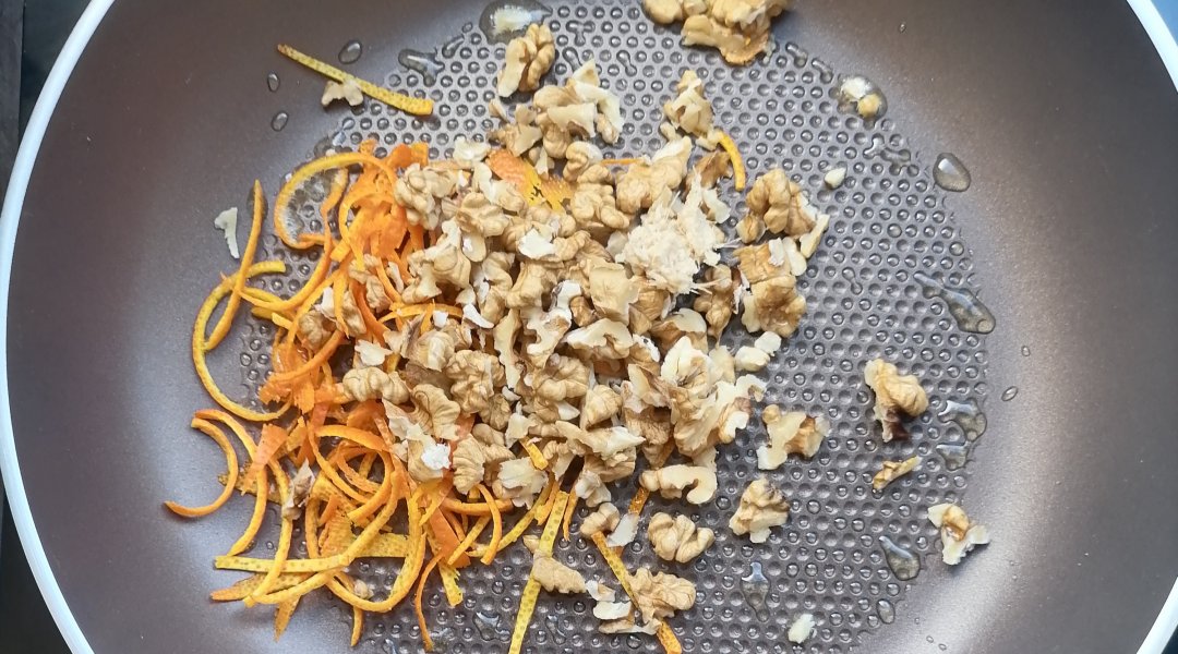 орехи, цедру и имбирь. Жарьте 2 минуты, помешивая.